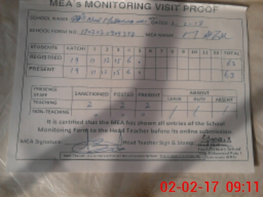 | Attendance Register | Head Teacher | MEA with School | Visit Proof |