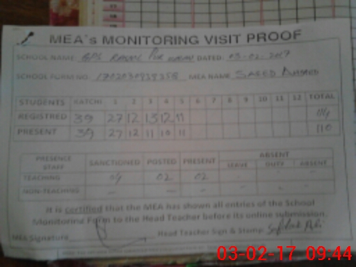 | Attendance Register | Head Teacher | MEA with School | Visit Proof |