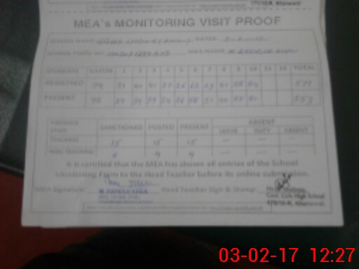 | Attendance Register | Head Teacher | MEA with School | Visit Proof |