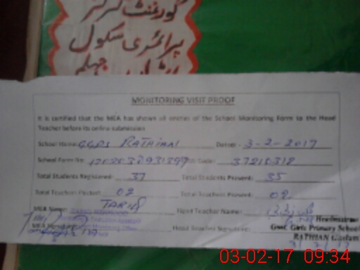 | District: JHELUM | Tehsil: JHELUM | Markaz: GHARMALA-FEMALE | Level: Primary | |