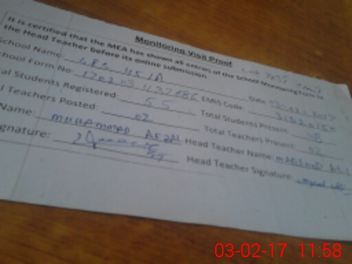 | Attendance Register | Head Teacher | MEA with School | Visit Proof |