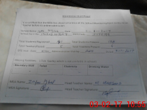 | School Visited by School Health & Nutrition Supervisor (No. of Visits) | 1 | Name1: | M USMAN | Name2: | NIL |