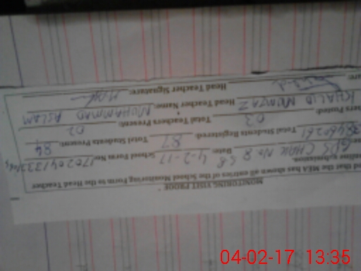 | School Visited by School Health & Nutrition Supervisor (No. of Visits) | 1 | Name1: | Muhammad Ansar Khan | Name2: | |