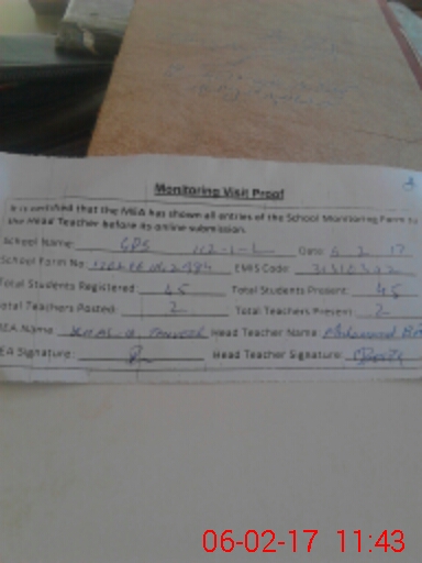 | Attendance Register | Head Teacher | MEA with School | Visit Proof |