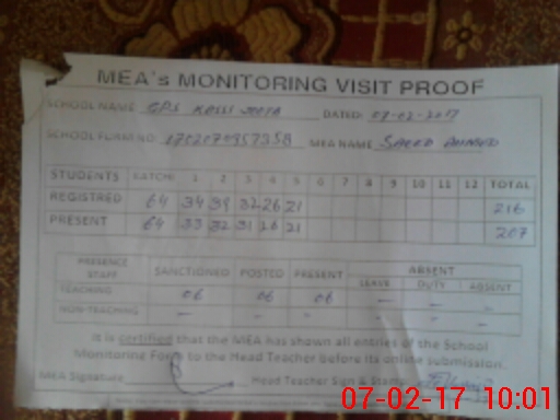| Attendance Register | Head Teacher | MEA with School | Visit Proof |