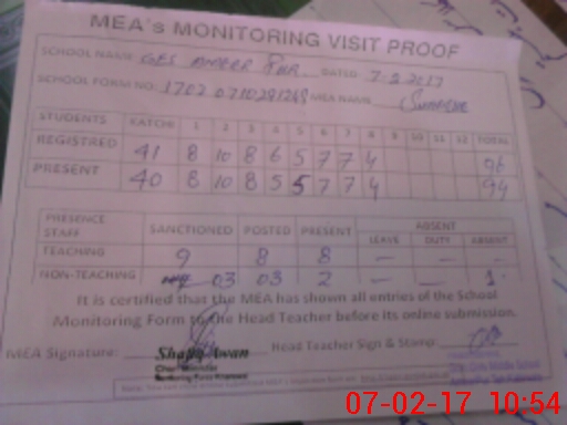 | Attendance Register | Head Teacher | MEA with School | Visit Proof |