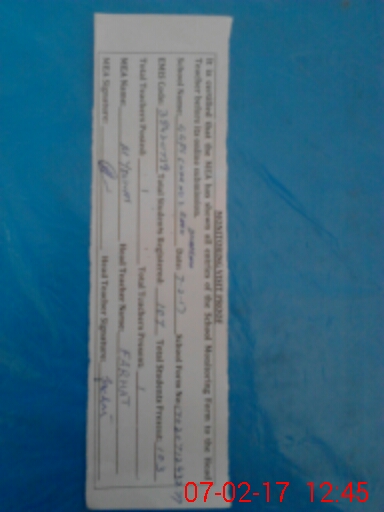 | School Visited by School Health & Nutrition Supervisor (No. of Visits) | 1 | Name1: | MUHAMMAD HASNAIN | Name2: | |