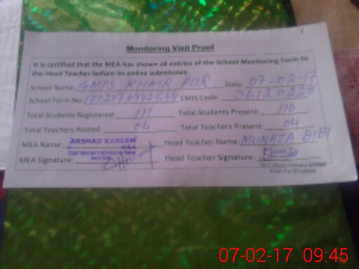 | EMIS Code: 36120228 | Name of School: GMPS KHAIR PUR SHUJABAD | |||