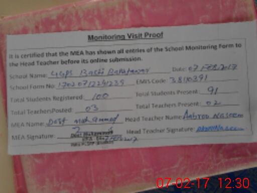 | Attendance Register | Head Teacher | MEA with School | Visit Proof |