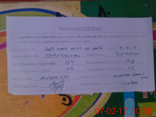 | Attendance Register | Head Teacher | MEA with School | Visit Proof |