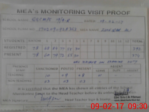 | Certified that this School was Inspected by the Undersigned MEA/DMO Today and the Information Stated Above is as Per Record. | |||||