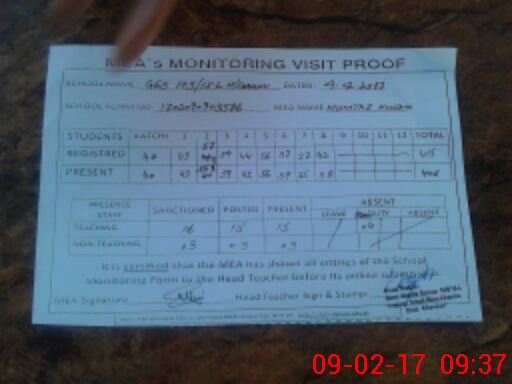 | Attendance Register | Head Teacher | MEA with School | Visit Proof |