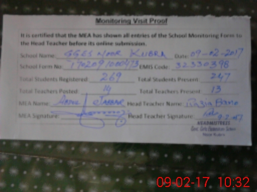| Attendance Register | Head Teacher | MEA with School | Visit Proof |
