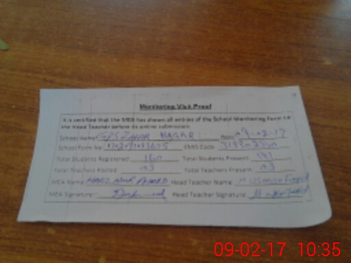 | School Visited by School Health & Nutrition Supervisor (No. of Visits) | 1 | Name1: | Muhammad Farhan | Name2: | Null |