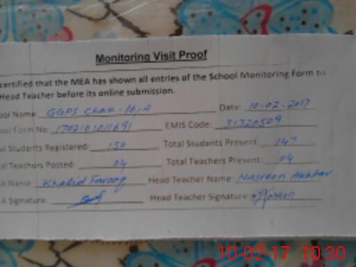 | EMIS Code: 31320509 | Name of School: GGPS CHAK NO.16/A | |||