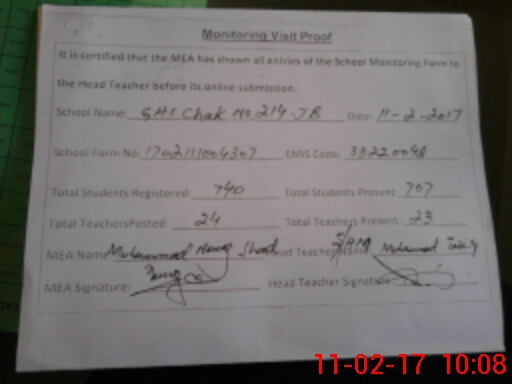 | Attendance Register | Head Teacher | MEA with School | Visit Proof |