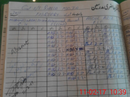 | CNIC | Full Name | Designation | R/C | Absence During Last Calender Month |
