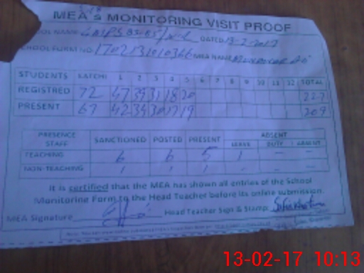 | Attendance Register | Head Teacher | MEA with School | Visit Proof |