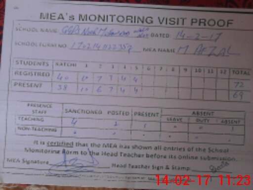 | Attendance Register | Head Teacher | MEA with School | Visit Proof |
