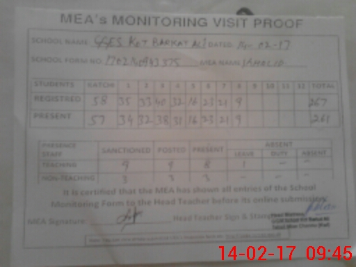 | Attendance Register | Head Teacher | MEA with School | Visit Proof |