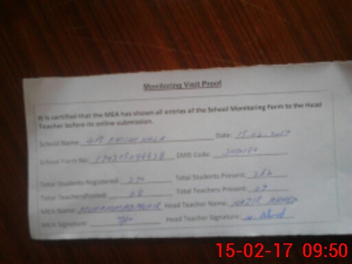| Attendance Register | Head Teacher | MEA with School | Visit Proof |