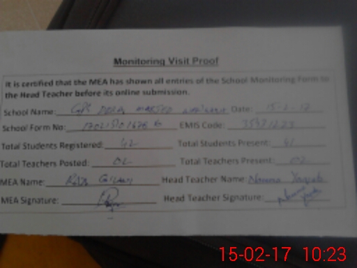 | Attendance Register | Head Teacher | MEA with School | Visit Proof |