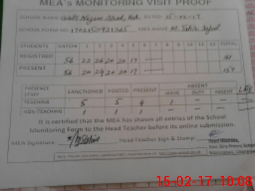 | Attendance Register | Head Teacher | MEA with School | Visit Proof |