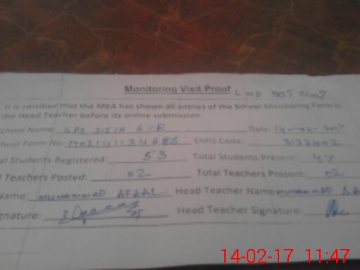| Attendance Register | Head Teacher | MEA with School | Visit Proof |