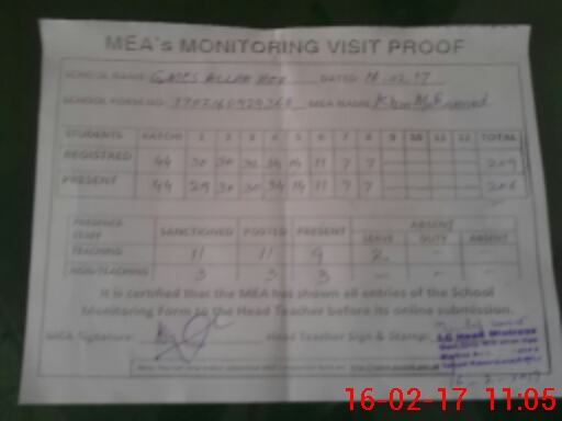 | Attendance Register | Head Teacher | MEA with School | Visit Proof |