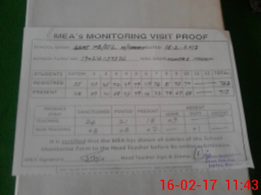 | Attendance Register | Head Teacher | MEA with School | Visit Proof |