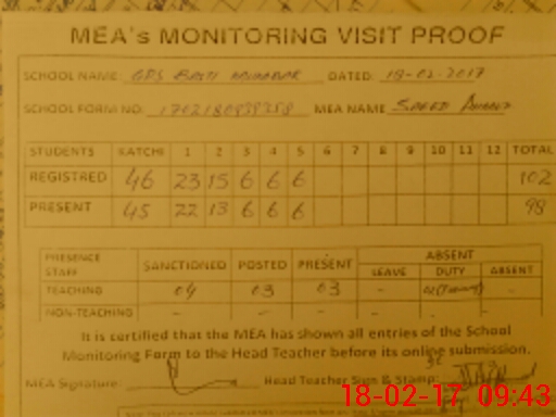 | Attendance Register | Head Teacher | MEA with School | Visit Proof |