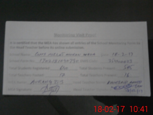 | Certified that this School was Inspected by the Undersigned MEA/DMO Today and the Information Stated Above is as Per Record. | |||||