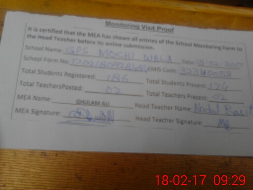 | EMIS Code: 32340058 | Name of School: GPS MOCHI WALA | |||