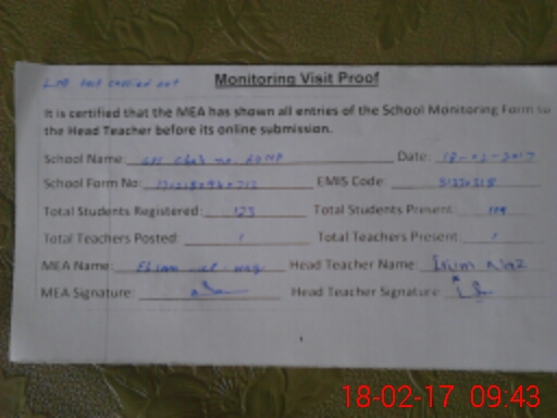 | Remarks (Use Separate Page if Required): Teacher paid from NSB is on leave NSB record is till 15Dec 2016 Good managed neat and clean school | |||||