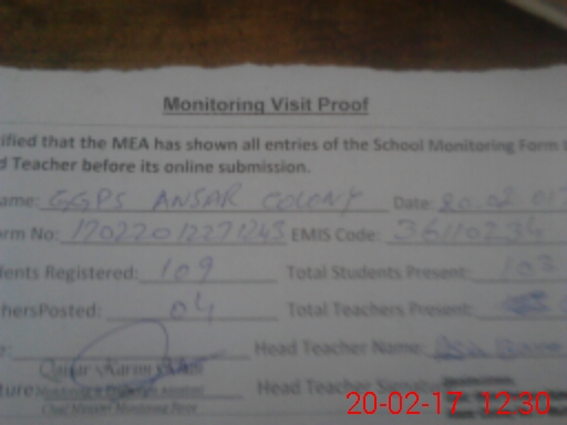| EMIS Code: 36110234 | Name of School: GGPS ANSAR COLONY NO.1 MULTAN | |||