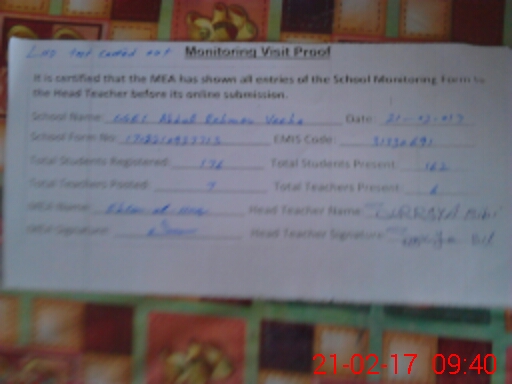| Attendance Register | Head Teacher | MEA with School | Visit Proof |