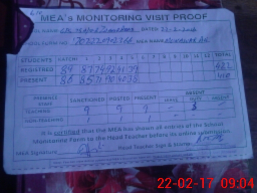 | Attendance Register | Head Teacher | MEA with School | Visit Proof |