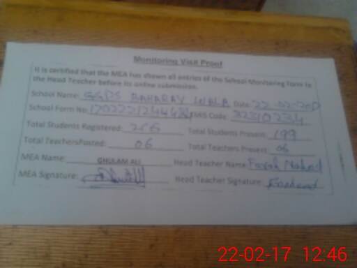 | EMIS Code: 32310234 | Name of School: GGPS BAHARAY WALA | |||