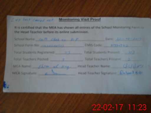 | Attendance Register | Head Teacher | MEA with School | Visit Proof |
