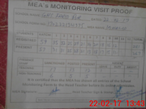 | Attendance Register | Head Teacher | MEA with School | Visit Proof |