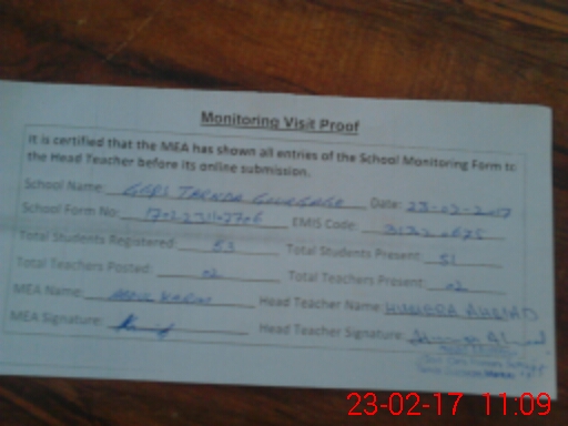 | Attendance Register | Head Teacher | MEA with School | Visit Proof |