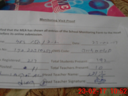| Attendance Register | Head Teacher | MEA with School | Visit Proof |
