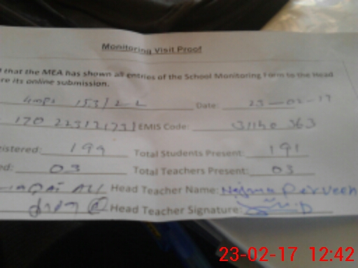 | Attendance Register | Head Teacher | MEA with School | Visit Proof |