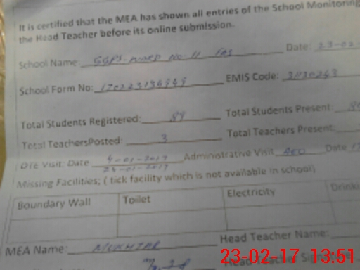 | Certified that this School was Inspected by the Undersigned MEA/DMO Today and the Information Stated Above is as Per Record. | |||||