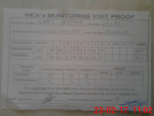 | Attendance Register | Head Teacher | MEA with School | Visit Proof |