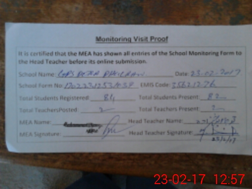 | Attendance Register | Head Teacher | MEA with School | Visit Proof |