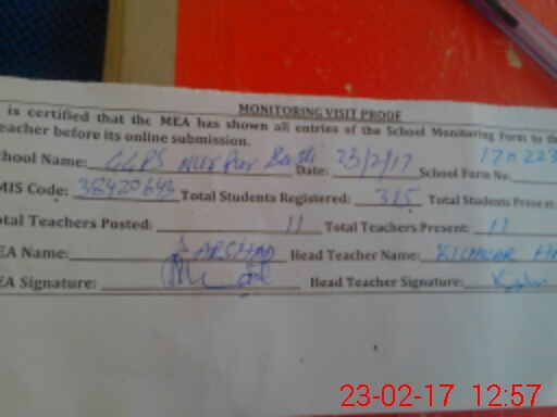 | Attendance Register | Head Teacher | MEA with School | Visit Proof |