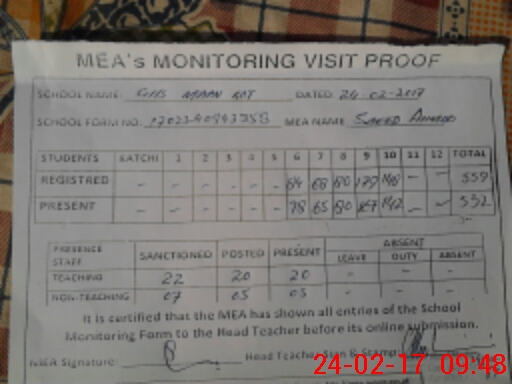 | Attendance Register | Head Teacher | MEA with School | Visit Proof |