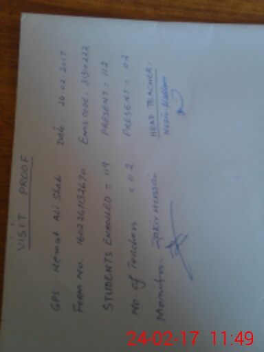| School Visited by School Health & Nutrition Supervisor (No. of Visits) | 1 | Name1: | Shamshad Hussain | Name2: | None |