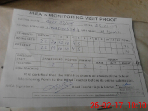| Attendance Register | Head Teacher | MEA with School | Visit Proof |